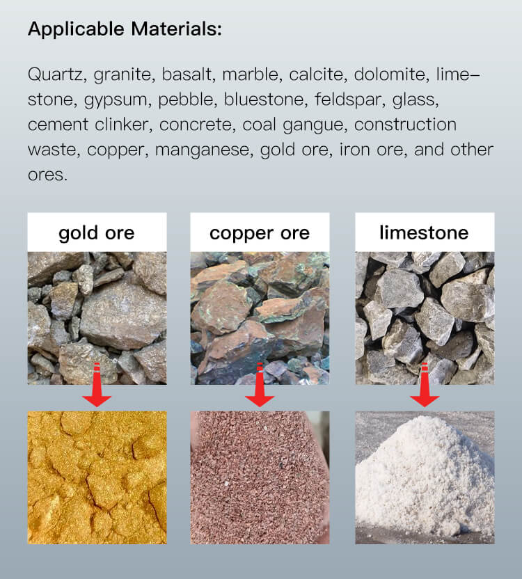 gold ore, copper ore, limestone, quartz stone, chrome, cement, stainless steel, manganese, clinker and gypsum, etc.